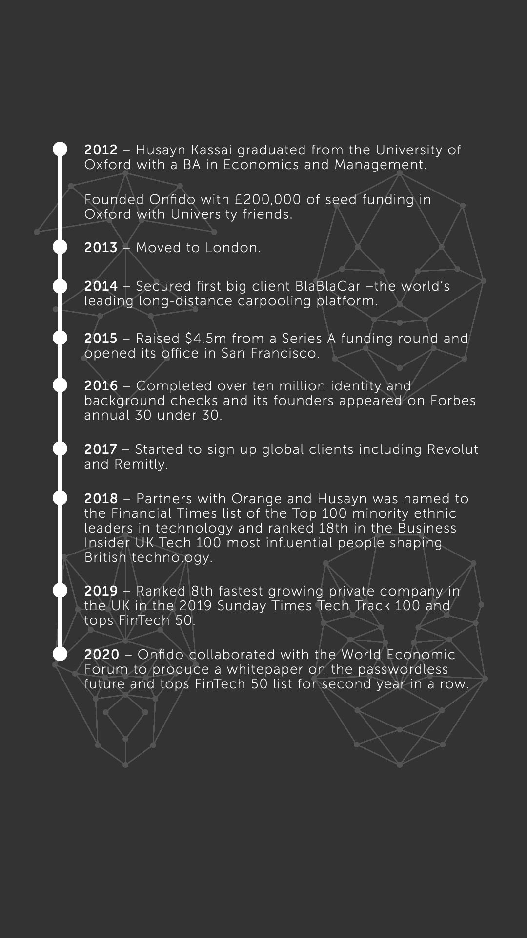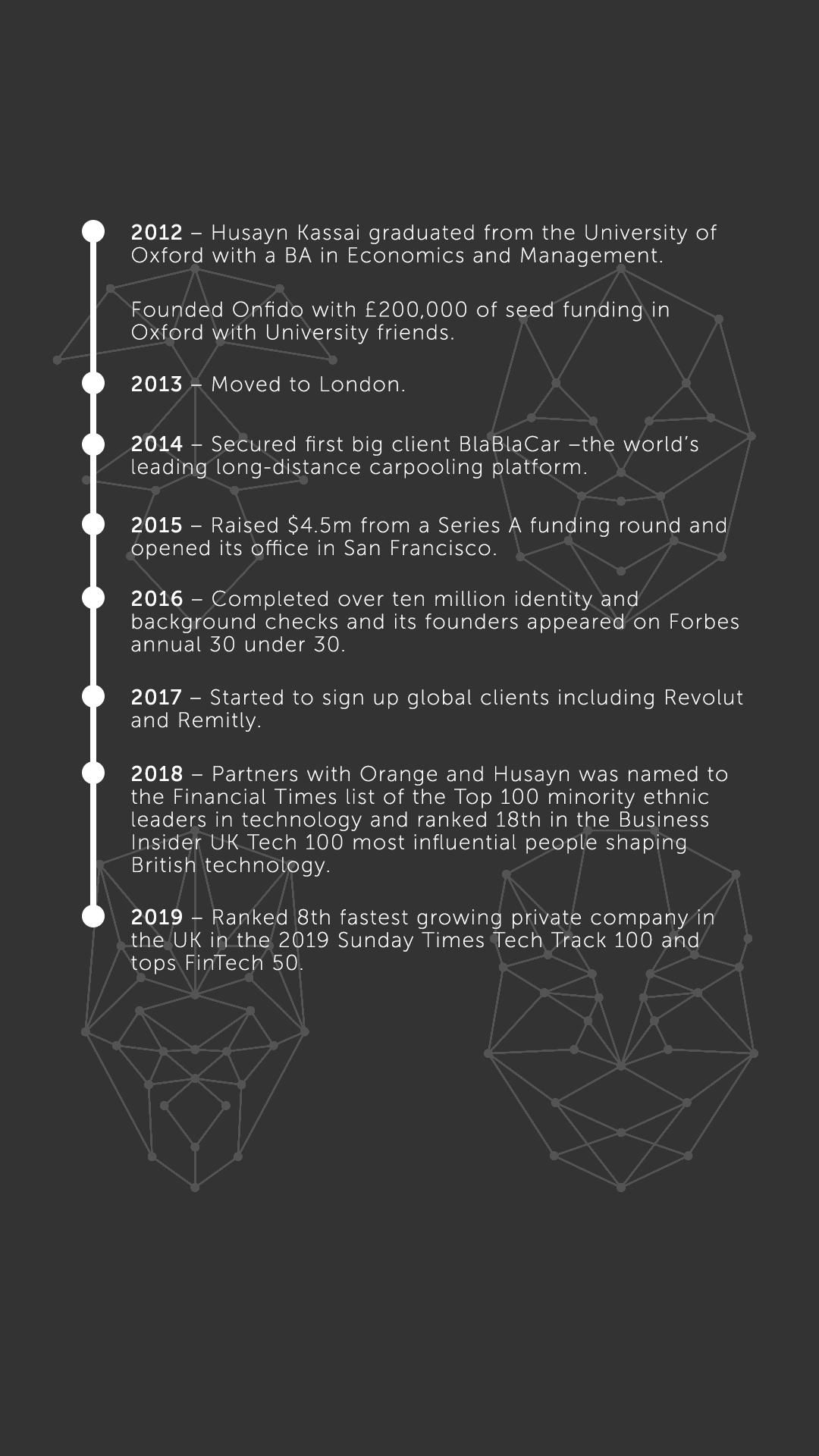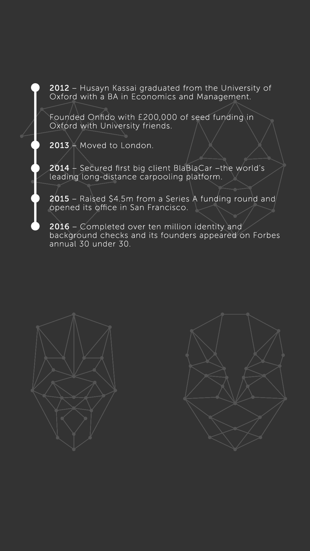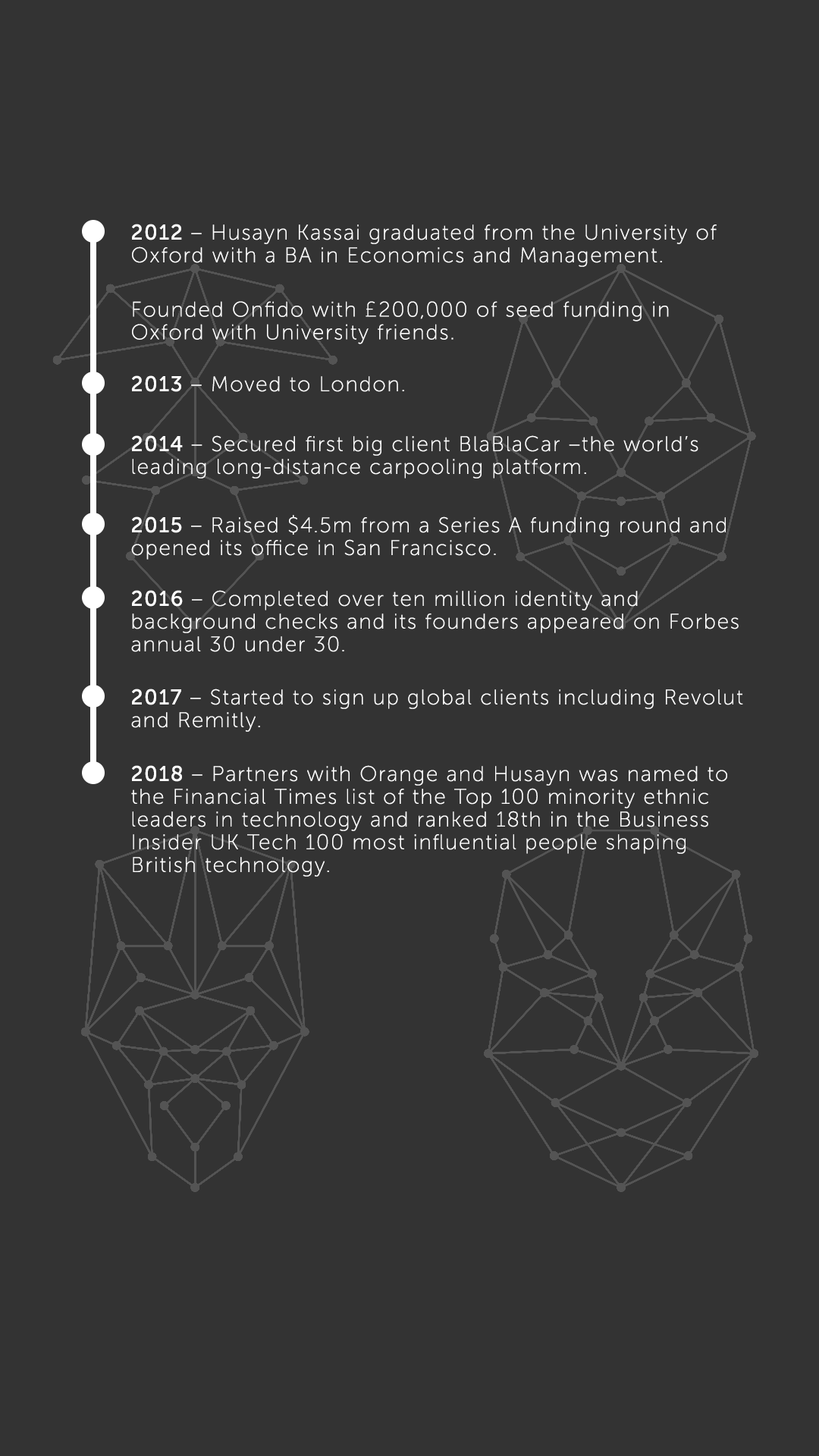 This inspired him to create Onfido whose mission is to facilitate an open worldwide verification entity and empower consumers to own and control their legal identity where they can decide which businesses they want to access their personal data.